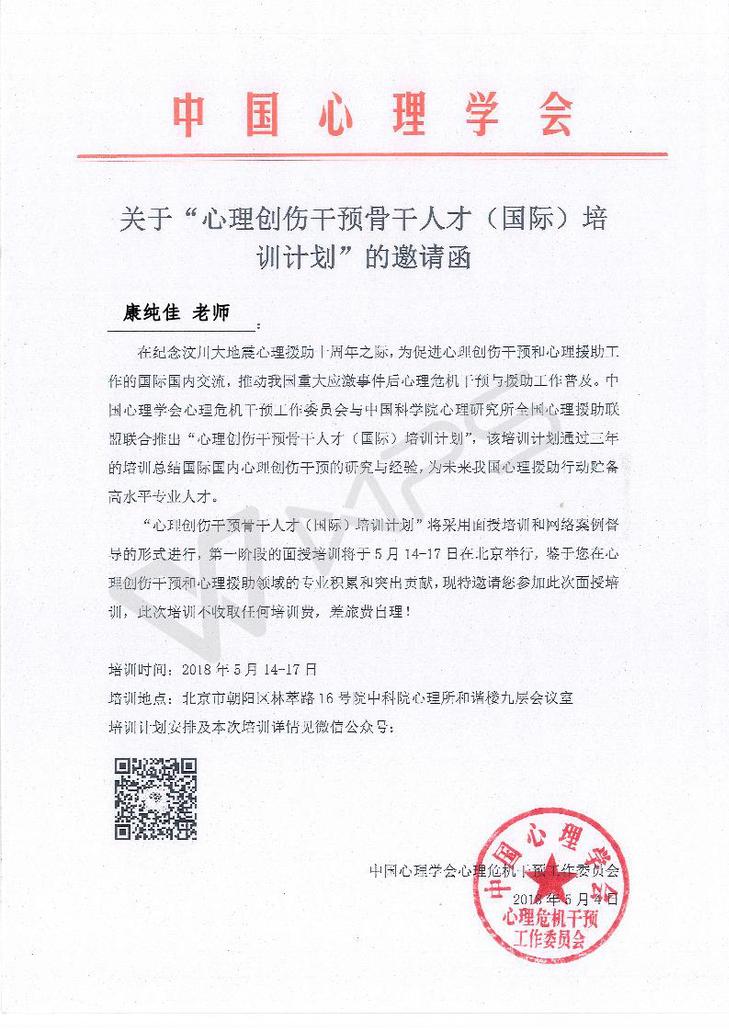 应中国心理学会邀请,我校心理咨询中心教师康纯佳于5月14日至17日赴中国科学院心理研究所参加“心理创伤干预骨干人才(国际)培训计划”培训班。