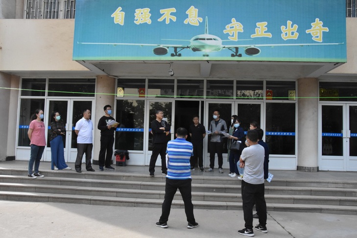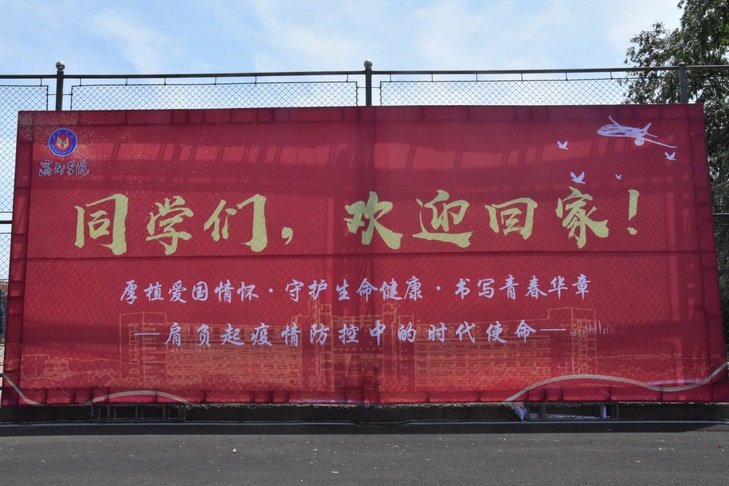 晾晒完被褥,学生工作处全体党员到学生复学报到篮球场布置报到场地,张贴各种引导标志,悬挂条幅,安装大型欢迎学生返校背景墙,努力营造热情洋溢的校园氛围。