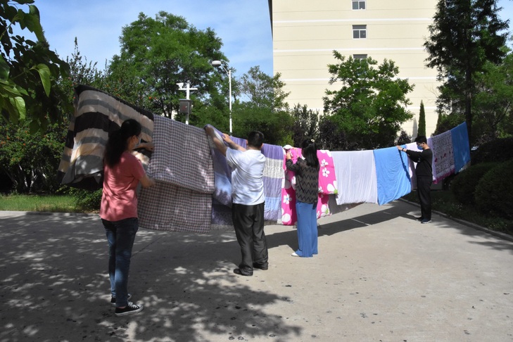 5月24日,第二批复学返校学生返校前夕,我校各学院辅导员走进学生公寓楼为返校学生宿舍通风、晒被褥。学生工作处党支部全体党员深入7号学生公寓与生物与环境工程学院、外国语学院辅导员队伍,为学生宿舍通风,为300余名学生,80余间宿舍晾晒被褥。学生工作处党支部和辅导员晾晒被褥团队根据统计的需求表分头进入各楼层打开房门、核对名单、确定床位、贴标签、晾晒被褥。学生工作处党支部在公寓区拴了若干晾衣绳,以便于学生返校后晾晒被褥衣物。根据学生反馈的需求情况,此项工作各二级学院将持续到6月份,切实帮助有晾晒被褥需求的学生晾晒一遍。