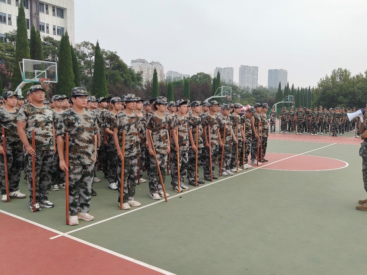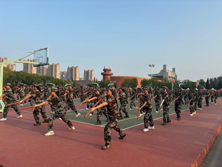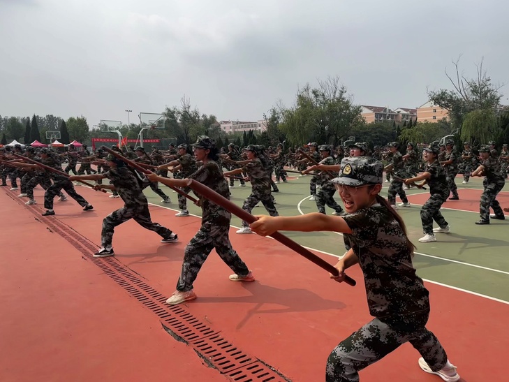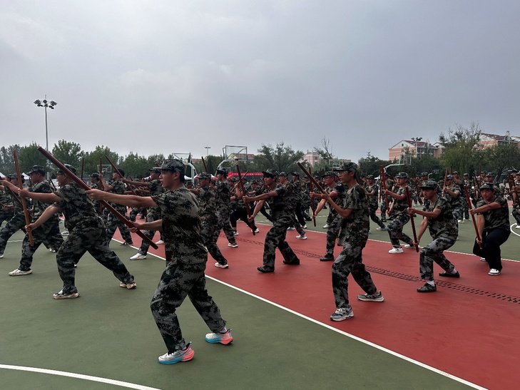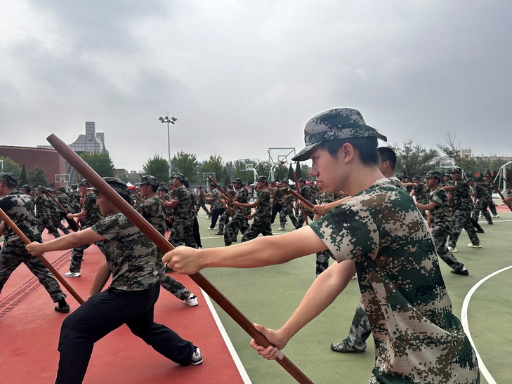 “突刺!刺!” 随着一声令下,全体学生同步出枪,枪尖直指前方,动作整齐划一。这不仅是军事技能的锤炼,更是意志品质的磨砺,畏难情绪在反复训练中消散,个人锋芒在集体协作中凝聚,“无畏、坚毅、团结” 的精神内核,随每一次挥枪深植心间。