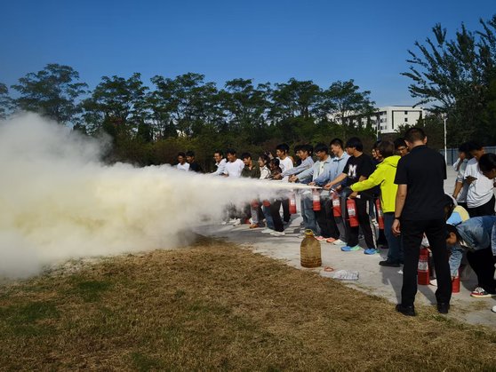 演练伊始,杨老师以近年高校典型火灾案例为切入点,详细复盘了高校因违规使用药品引发起火、设备未断电导致燃烧等事故,用真实事件敲响安全警钟,让新生直观认识到实验室消防安全的重要性。随后,聚焦常用的干粉灭火器与二氧化碳灭火器,系统讲解了“提、拔、握、压”四步使用法,并在现场设置模拟火点,邀请同学们依次上前实操。“使用喷嘴一定要对准火焰根部!”老师手把手纠正学生动作细节,从站姿到喷射角度逐一指导,确保每位同学都能规范操作,实效应用。
