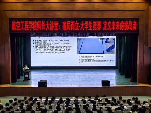 为切实引导2025级新生系好大学学习生活的“第一粒扣子”,帮助他们确定大学阶段的发展方向,高质量地开展入学教育,10月15日晚,航空工程学院在学苑会堂举办"师长大讲堂"活动,活动由学生科科长赵望锋主持,学院高金海博士携两名学科竞赛优秀学生担任主讲人,全体2025级新生参加了活动。