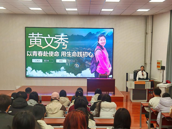 宣讲团成员韩嘉鑫讲述了中国共产党唯一的女创始人—向警予的光辉事迹,以“青春之问”开篇,通过讲述向警予坚定信仰、勇挑重担、与党同行的奋斗历程,生动诠释了革命先辈“用生命点燃信仰之火,以行动践行理想之光”的崇高精神,借详实史实与真挚情感诠释其“以天下为己任”的担当,并结合徐枫灿、陈祥榕等当代榜样,号召同学以学习筑牢信念、以家国情怀扛使命;宣讲团成员高小冉聚焦黄文秀的“青春选择”,讲述她放弃留京、扎根百坭村,用走访绘图打破质疑,带村民修公路、引技术、建电商站,使贫困发生率大幅下降,最终暴雨夜为防汛殉职的事迹。高小冉通过黄文秀“心中的长征”与当下乡村振兴中的青年力量,传递出“青春的价值在于奉献,人生的意义在于担当”的深刻内涵,激励在场青年要将个人理想融入国家发展大局。现场同学纷纷表示,将以向警予、黄文秀为榜样,把感动化为行动,在学习工作生活中践行“青春心向党”的誓言,用奋斗书写无愧于时代的青春篇章。