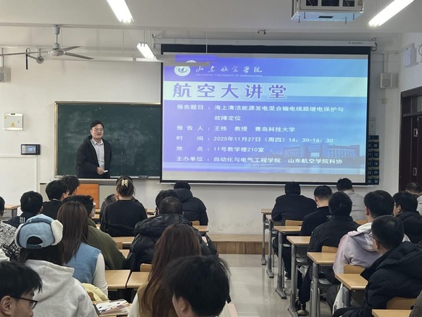 2025年11月27日,自动化与电气工程学院于11教210成功举办航空大讲堂学术报告。青岛科技大学王栋教授应学院诚挚邀请,为学院师生作《海上清洁能源发电混合输电线路继电保护与故障定位》专题报告,学院部分师生代表参加。