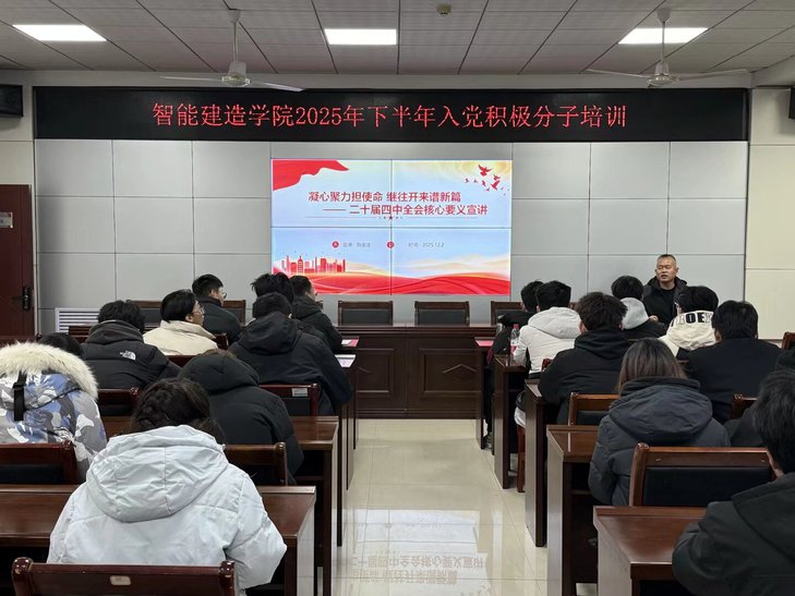 为深入学习贯彻党的最新理论成果,进一步加强对入党积极分子的培养教育,提升其政治素养和理论水平,2025年12月2日,智能建造学院于9号教学楼215室召开2025下半年入党积极分子培训会议。本次培训由学院党委副书记韩安庄作题为《凝心聚力担使命 继往开来谱新篇》的专题辅导报告,全面深入解读党的二十届四中全会核心要义与精神实质。