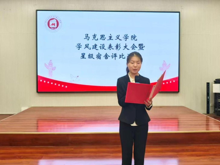 为深化学风建设,打造特色宿舍文化,12月12日,马克思主义学院于2教310会议室举办学风建设表彰大会暨星级宿舍评比活动。本次活动由关雅琪同学主持,学生科长尚璐璐老师、副科级秘书郑连盟老师及辅导员李宇奇老师出席,获奖宿舍成员与2025级全体学生参加。